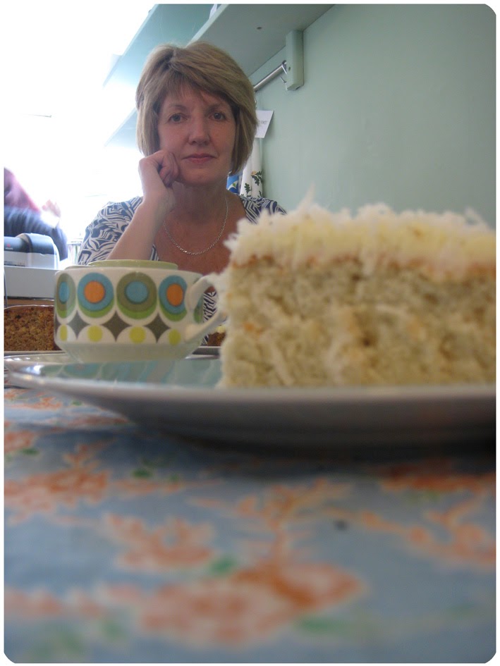 I finally got to experience cake (and beautiful '50s decor) from Auntie M's Cake Lounge, when I took my mum and dad there this weekend. Here's my mum peeking out from behind my crazily delicious coconut sponge.